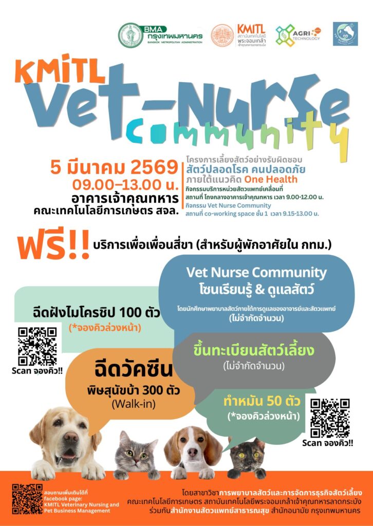 KMITL Vet Nurse Community 5 มีนาคม 2569 09.00 – 13.00 น. อาคารเจ้าคุณทหาร คณะเทคโนโลยีการเกษตร สจล. ในงานมีครบ จบในที่เดียว บริการเพื่อเพื่อนสี่ขา (สำหรับผู้พักอาศัยใน กทม.) ฟรี!!!