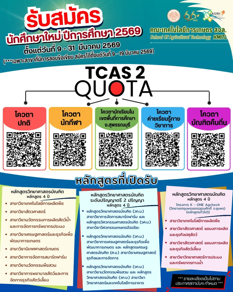 TCAS 2 รอบโควตา คณะเทคโนโลยีการเกษตร สจล. มาแล้ววววว เปิดรับสมัครนักศึกษาปริญญาตรี ปีการศึกษา 2569 สมัครได้ตั้งแต่วันที่ 9-31 มีนาคม 2569 (กำหนดการตามประกาศระบุ) ข่าวทั้งหมด, รับสมัครนักศึกษา / By Thapana เฉพาะสาขาที่มีการสอบข้อเขียนสมัครได้ตั้งแต่วันที่ 9-19 TCAS 2 รอบโควตา คณะเทคโนโลยีการเกษตร สจล. มาแล้ววววว เปิดรับสมัครนักศึกษาปริญญาตรี ปีการศึกษา 2569 สมัครได้ตั้งแต่วันที่ 9-31 มีนาคม 2569 (กำหนดการตามประกาศระบุ) Read More »