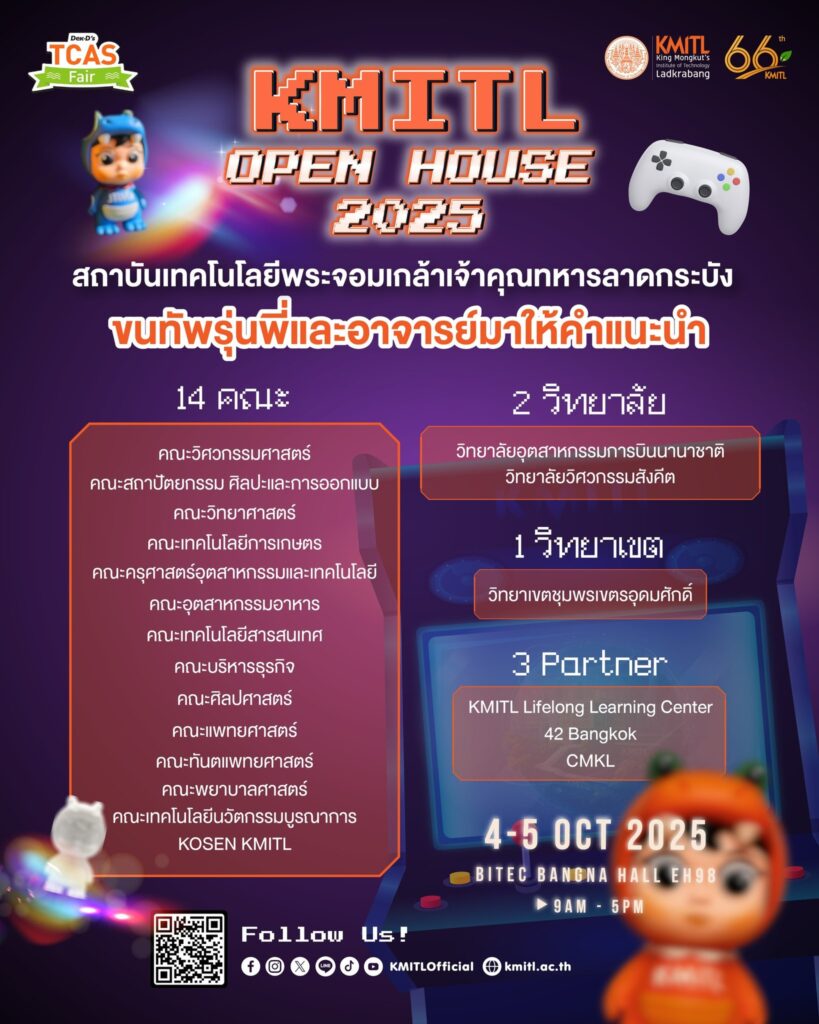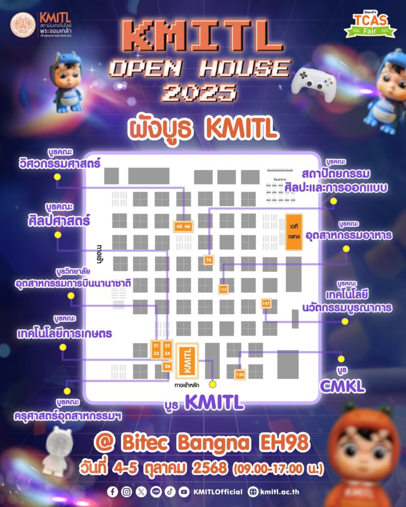 พบกันที่งาน KMITLOpenHouse x Dek-D’s TCAS Fair 🧡💚 เข้างานฟรี!!! คณะเทคโนโลยีการเกษตร บูธ34 และ บูธส่วนกลางkmitlBy Thapana / 29/09/2025 พบเจอกับรุ่นพี่และอาจารย์หลากหลายจากหลักสูตร พร้อมพาทุกคนสนุกไปกับโลกแห่ง “KMITL : Living Lab” ภายในงาน Dek-D’s TCAS Fair 2025น้องๆอย่าลืมเตรียม iFolio ให้พร้อม แล้วมาตะลุยในโลกแห่ง “KMITL : Living Lab”สร้างโปรไฟล์ : https://ifolio.kmitl.ac.th/signin รอได้เลย!! 4 – 5 October 2025 | 9AM – 5PM บูธ VIP @BITEC Bangna EH 98 ไม่ต้องลงทะเบียน พิเศษ! เปิดทำพอร์ตฟรีทาง : https://ifolio.kmitl.ac.th/signin ติดตามข้อมูลเพิ่มเติม : https://linktr.ee/kmitlofficial