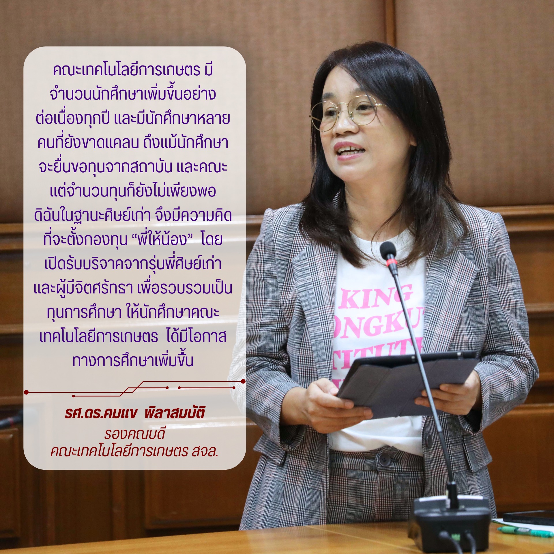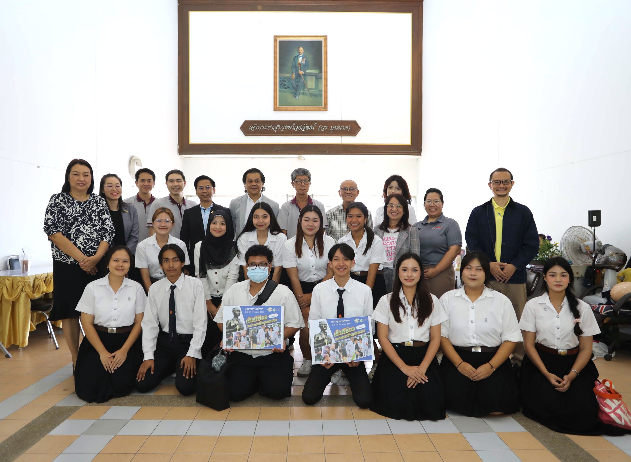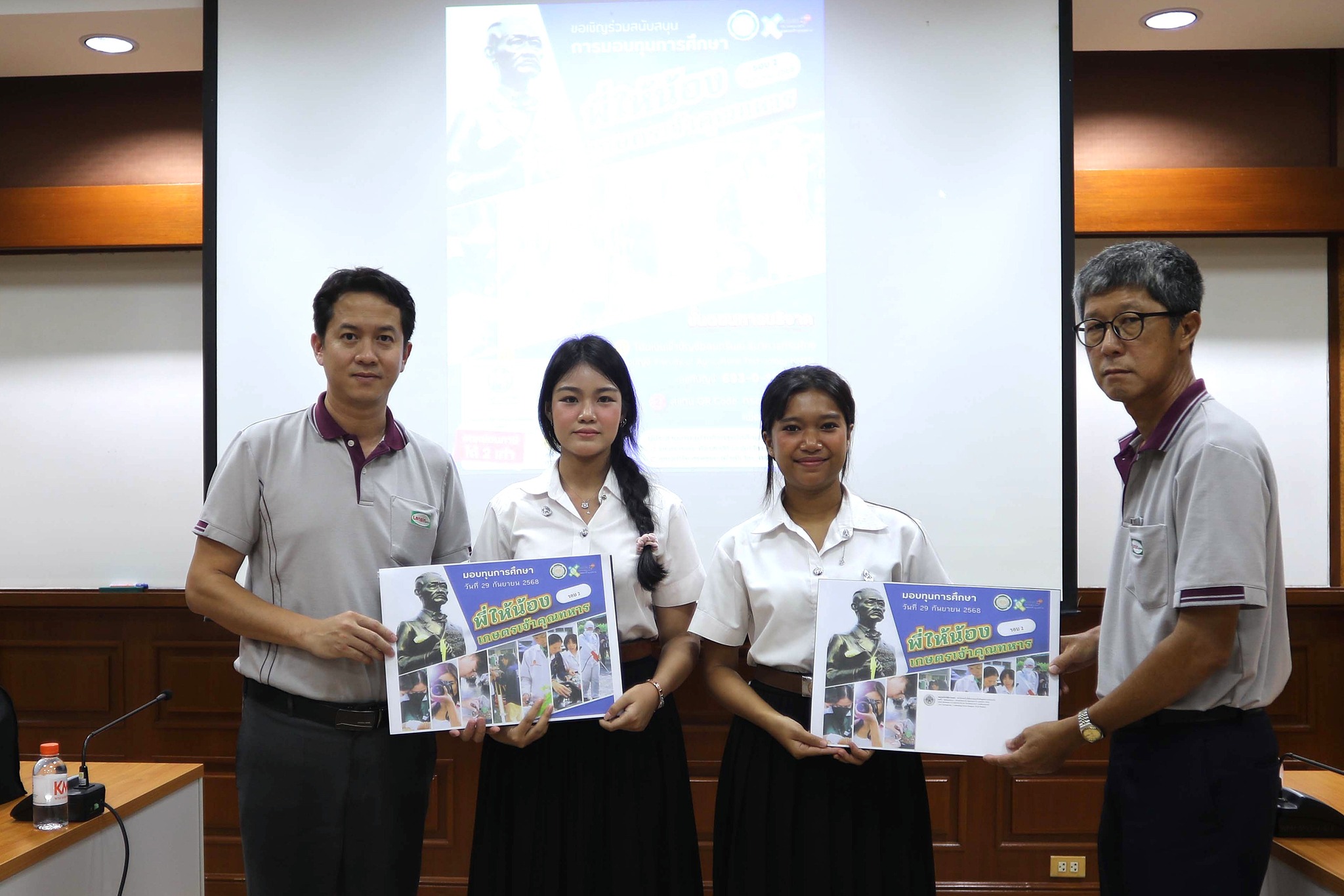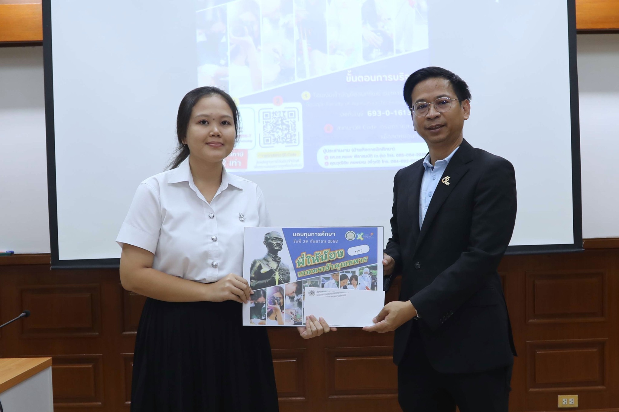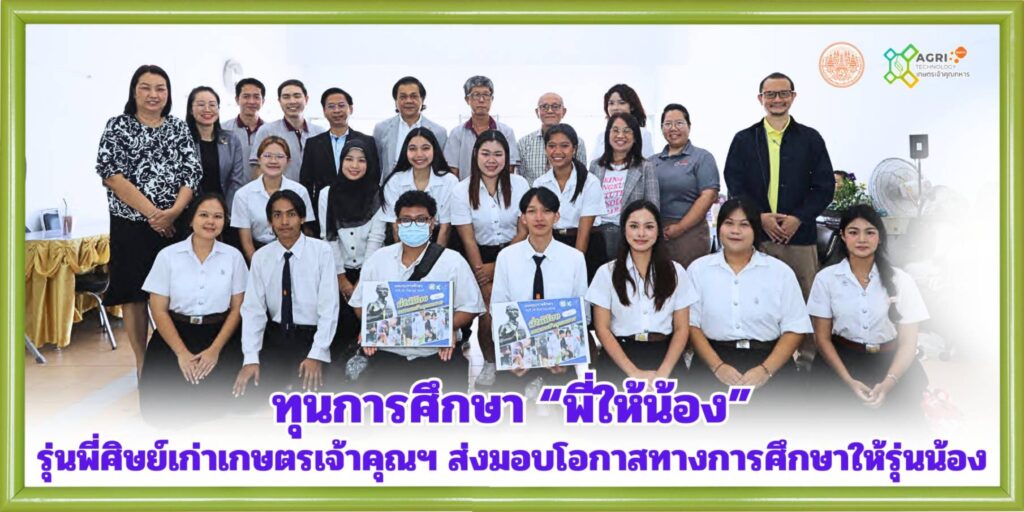 วันที่ 29 กันยายน 2568 คณะเทคโนโลยีการเกษตร จัดพิธีมอบทุนการศึกษา “พี่ให้น้อง” โดย ผศ.ดร.ธงชัย พุฒทองศิริ คณบดี พร้อมด้วยผู้แทนศิษย์เก่า ร่วมมอบทุนการศึกษา จำนวน 18 ทุนBy Thapana / 06/10/2025 วันที่ 29 กันยายน 2568 คณะเทคโนโลยีการเกษตร จัดพิธีมอบทุนการศึกษา “พี่ให้น้อง” โดย ผศ.ดร.ธงชัย พุฒทองศิริ คณบดี พร้อมด้วยผู้แทนศิษย์เก่า ร่วมมอบทุนการศึกษา จำนวน 18 ทุน ดังนี้ทุนช่วยเหลือขาดแคลน 15 ทุน ทุนละ 5,000 บาท รวมเป็นเงิน 75,000 บาททุนบริษัทนีโอบลู จำกัด ช่วยเหลือค่าเทอม เทอมละ 10,000 บาท จำนวน 2 ทุน รวมเป็นเงิน 20,000 บาททุน ดร.วรวิทย์ พันธุ์เมธิศร์ กรรมการผู้จัดการบริษัท พี. เอส. อินเตอร์เวท จำกัด บริจาคทุนการศึกษาให้นักศึกษาหลักสูตรเทคโนโลยีการผลิตสัตว์และประมง เป็นค่าเล่าเรียน เทอมละ 20,000 บาท จนจบการศึกษากองทุน #พี่ให้น้อง เป็นโครงการระดมเงินบริจาคจากศิษย์เก่าคณะเทคโนโลยีการเกษตรและผู้มีจิตศรัทธา โดยดำเนินงานมาตั้งแต่เดือนพฤศจิกายน 2567 จนถึงปัจจุบัน มียอดเงินบริจาครวม 352,999.00 บาท โดยได้มอบทุนการศึกษาครั้งที่ 1 เมื่อเดือนมีนาคม 2568 จำนวน 23 ทุน เป็นเงิน 140,000 บาท และครั้งที่ 2 นี้ จำนวน 18 ทุนสำหรับท่านใดที่มีความประสงค์จะร่วมบริจาคในโครงการระดมทุนการศึกษา “พี่ให้น้อง” สามารถโอนเงินเข้าบัญชี Faculty of Agricultural Technology เลขที่ 693-0-16135-7 ธนาคารกรุงไทย และแสกน QR Code เพื่อส่งหลักฐานการโอนเงิน (ลดหย่อนภาษีได้ 2 เท่า)คณะเทคโนโลยีการเกษตร สจล. ขอขอบพระคุณศิษย์เก่าและผู้มีจิตศรัทธาทุกท่านที่ได้ร่วมบริจาคเงินเพื่อมอบโอกาสทางการศึกษา สร้างปัญญาให้แผ่นดิน