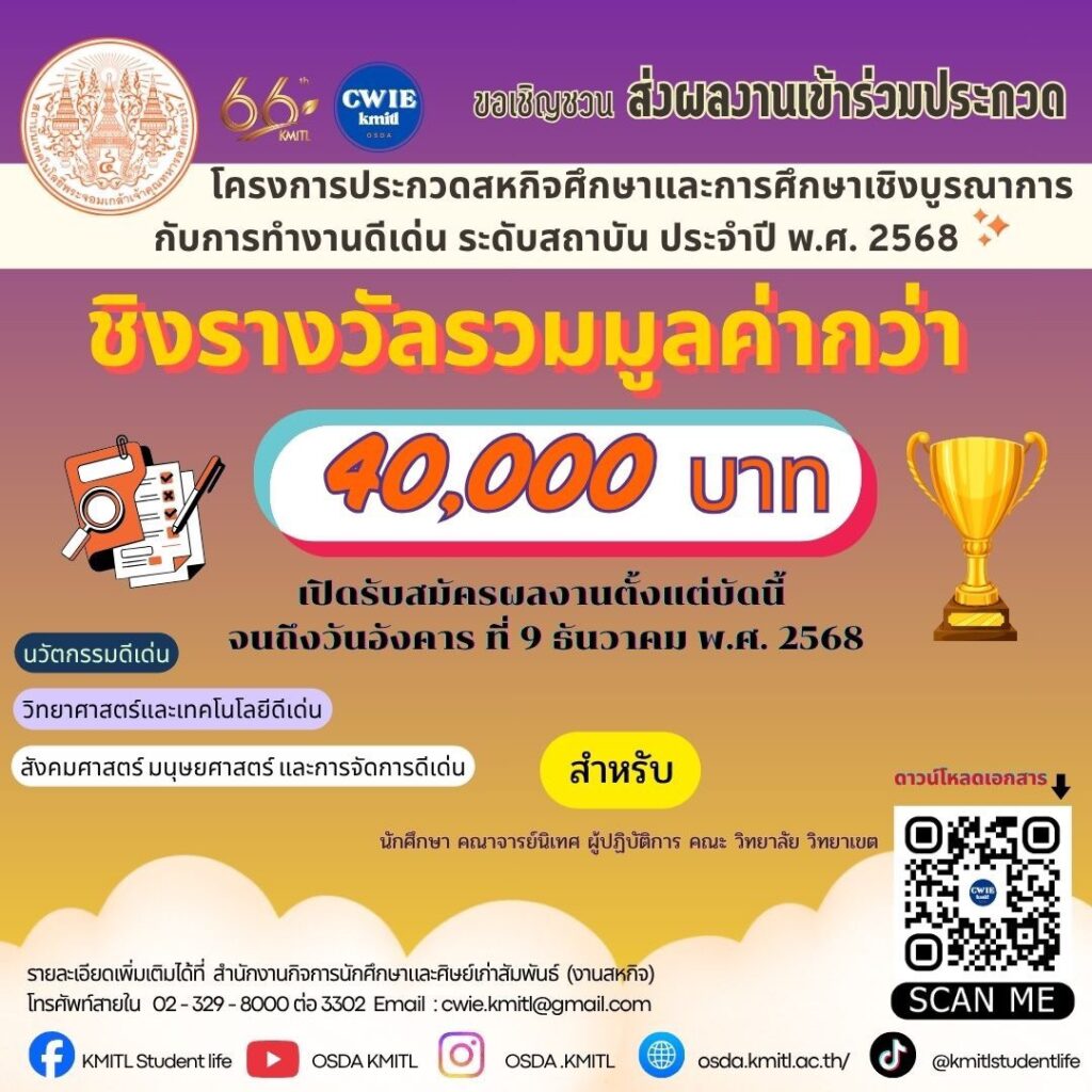 โครงการ ประกวดสหกิจศึกษาและการศึกษาเชิงบูรณาการกับการทำงานดีเด่น ระดับสถาบัน ประจำปี พ.ศ. 2568 ชิงรางวัลรวมมูลค่ากว่า 40,000 บาท!By Thapana / 25/11/2025 เปิดรับสมัครตั้งแต่วันนี้ – 24 ธันวาคม 2568ประเภทที่ส่งเข้าประกวด : นวัตกรรมดีเด่น วิทยาศาสตร์และเทคโนโลยีดีเด่น สังคมศาสตร์ มนุษยศาสตร์ดีเด่น สำหรับนักศึกษาคณาจารย์นิเทศ ผู้ปฏิบัติงานสหกิจฯ ทุกคณะ วิทยาลัย และวิทยาเขต ดาวน์โหลดเอกสารและดูรายละเอียดเพิ่มเติมได้ที่ :https://shorturl.at/b7ynC Email: cwie.kmitl@gmail.com โทร. 0-2329-8000 ต่อ 3302