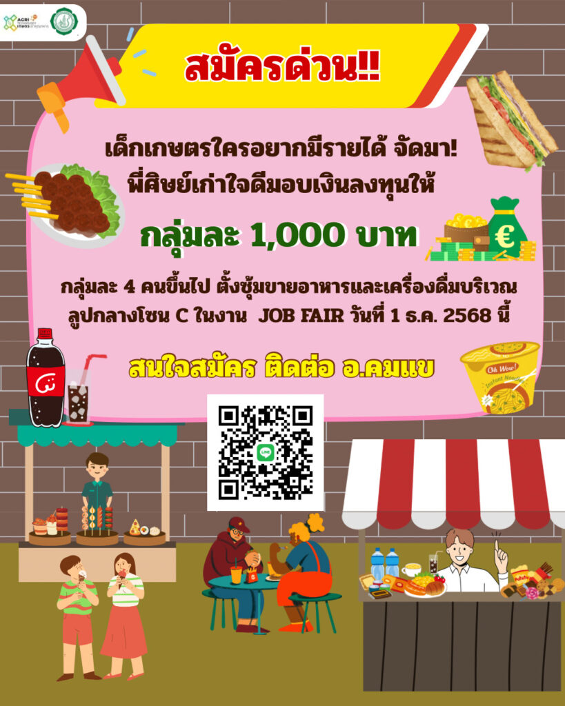 รับสมัคร #เด็กเกษตร มาเป็นพ่อค้าแม่ค้า ขายอาหาร และเครื่องดื่ม ในงาน JOB FAIR วันที่ 1 ธ.ค. 68 ที่อาคารเจ้าคุณทหาร คณะเทคโนโลยีการเกษตรBy Thapana / 25/11/2025 จะมาเดี่ยว มาคู่ หรือมาเป็นหมู่คณะก็ยินดีรับหมดสมัครด่วน : อาจารย์คมแข (สแกน QR CODE )