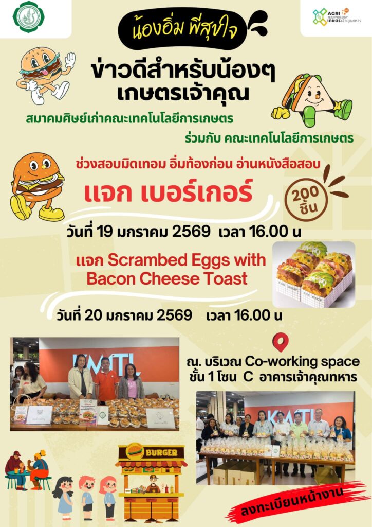 กิจกรรม “น้องอิ่ม พี่สุขใจ” พี่ ๆ สมาคมศิษย์เก่าคณะเทคโนโลยีการเกษตร ร่วมกับ คณะเทคโนโลยีการเกษตร จัดกิจกรรมแจกอาหารว่างBy Thapana / 15/01/2026 เติมพลังให้น้อง ๆ เกษตรเจ้าคุณในการสอบกลางภาค 2/2568 วันที่ 19 มกราคม 2569 เวลา 16.00 น. เป็นต้นไป แจก แจก แจกเบอร์เกอร์หมู จำนวน 200 ชิ้น วันที่ 20 มกราคม 2569 เวลา 16.00 น. เป็นต้นไป แจก แจก แจกScrambed Eggs Bacon จำนวน 200 ชิ้น สิทธิพิเศษเฉพาะเด็กเกษตรเจ้าคุณทุกชั้นปีอย่าลืมพกบัตรนักศึกษามาด้วยน๊าแล้วพบกันที่ห้อง Co-Working Space ชั้น 1 โซน C อาคารเจ้าคุณทหาร แล้วเรามาพบกัน …ฮึบ…ฮึบ