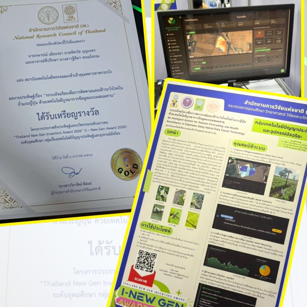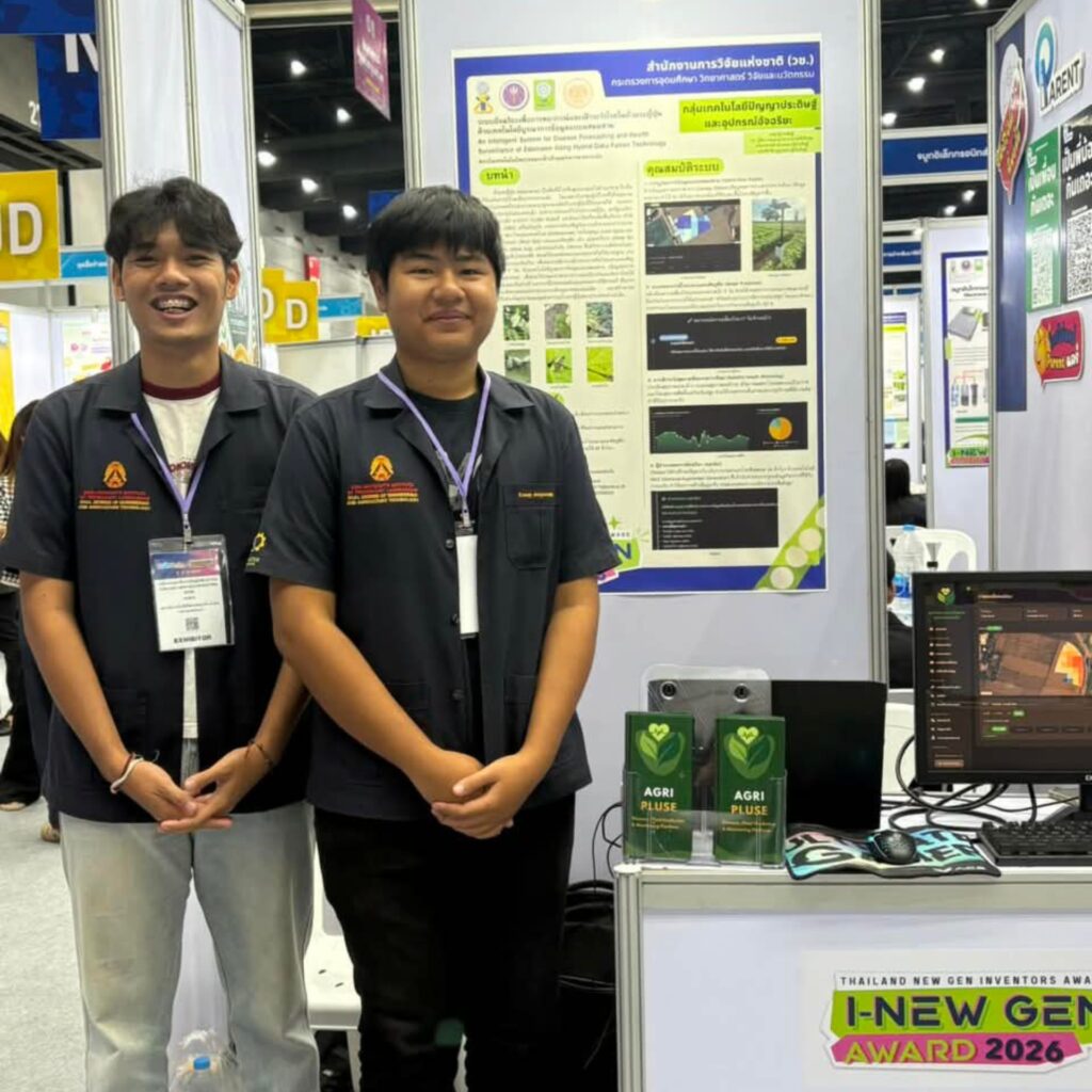 คณะเทคโนโลยีการเกษตร ขอร่วมแสดงความยินดีกับ นายกษาปณ์ เม้ยนรธา นายพิทวัส บุญเนตร นักศึกษาชั้นปีที่ 4 สาขาวิชาการจัดการสมาร์ตฟาร์ม–วิศวกรรมเกษตรอัจฉริยะBy Thapana / 22/01/2026 พร้อมด้วย อาจารย์ ดร.ฐิติมา พนมโสภณ อาจารย์ที่ปรึกษาที่ได้รับรางวัลเหรียญทอง จากการแข่งขันโครงการประกวดสิ่งประดิษฐ์และนวัตกรรมระดับเยาวชน “Thailand New Gen Inventors Award 2026 (I-New Gen Award 2026)” ระดับอุดมศึกษากลุ่มเรื่อง เทคโนโลยีปัญญาประดิษฐ์และอุปกรณ์อัจฉริยะ จากผลงานประดิษฐ์เรื่อง “ระบบอัจฉริยะเพื่อการติดตามและเฝ้าระวังโรคในถั่วแระญี่ปุ่น ด้วยเทคโนโลยีบูรณาการข้อมูลแบบผสมผสาน”…ขอแสดงความยินดีมา ณ โอกาสนี้อีกครั้ง…