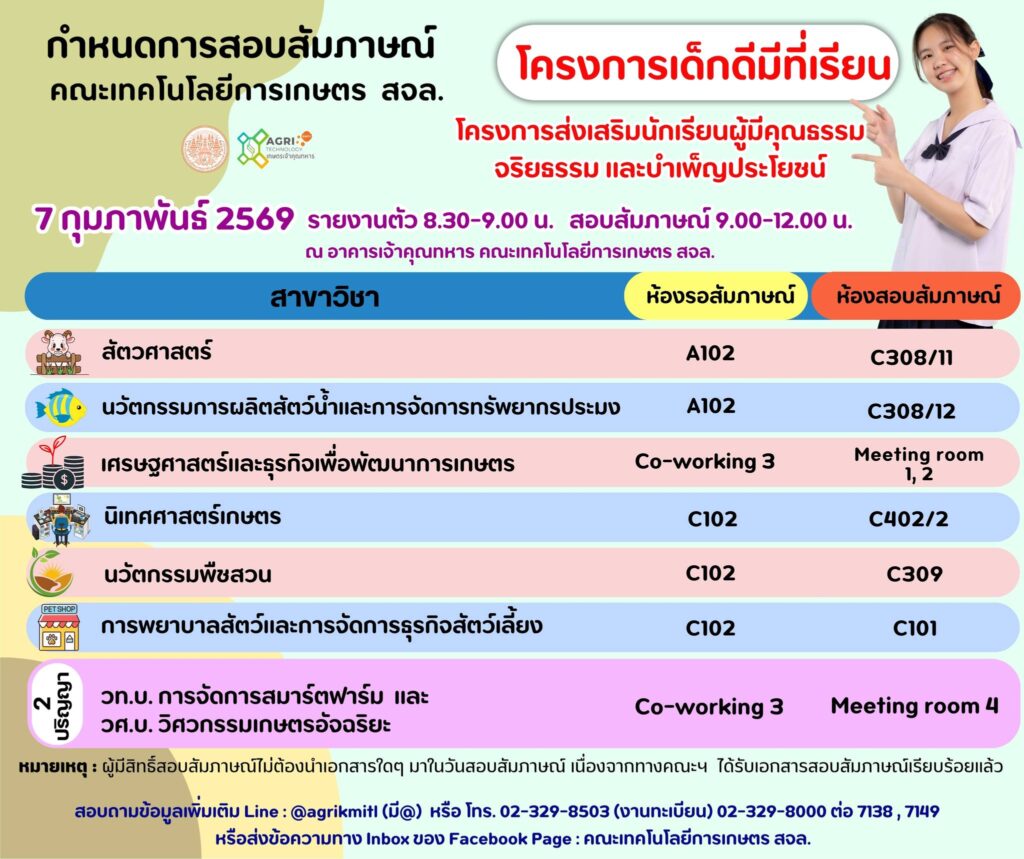 กำหนดการสอบสัมภาษณ์โครงการส่งเสริมนักเรียนผู้มีคุณธรรม จริยธรรม และบำเพ็ญประโยชน์ (โครงการเด็กดีมีที่เรียน) คณะเทคโนโลยีการเกษตร สจล.By Thapana / 06/02/2026 เรามีนัดสอบสัมภาษณ์กัน วันที่ 7 กุมภาพันธ์ 2569ที่อาคารเจ้าคุณทหาร คณะเทคโนโลยีการเกษตรใครมาก่อนรีบรายงานตัวเลยนะครับเผื่อเวลาเดินทางให้ดี มีงานเกษตรเจ้าคุณทหารแฟร์ที่บริเวณรอบอาคารเจ้าคุณฯสามารถจอดรถได้ที่บริเวณหน้าหอประชุม วร บุนนาค