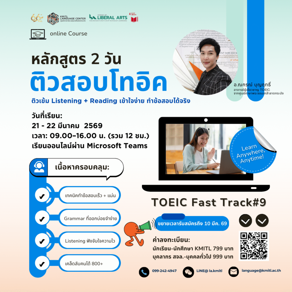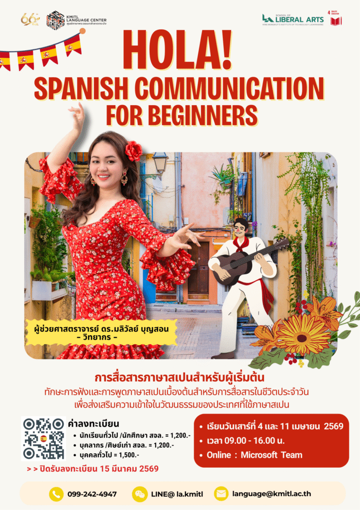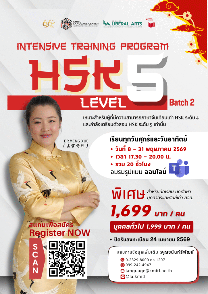 คณะศิลปศาสตร์ จัดโครงการอบรมพัฒนาศักยภาพทักษะทางภาษา จำนวน 4 หลักสูตรBy piyawat srisawat / 10/03/2026 ผู้สนใจสามารถลงทะเบียนอบรมผ่าน QR-code ตามแผ่นประชาสัมพันธ์ที่แนบมา หรือติดตามข่าวสารการอบรม/การสอบวัดระดับภาษา โดยศูนย์ภาษาพระจอมเกล้าลาดกระบัง ได้ที่ https://www.facebook.com/KMITL.LCบุคลากรของ สจล. สามารถขออนุมัติเงินค่าใช้จ่ายเป็นค่าลงทะเบียนจากต้นสังกัดได้