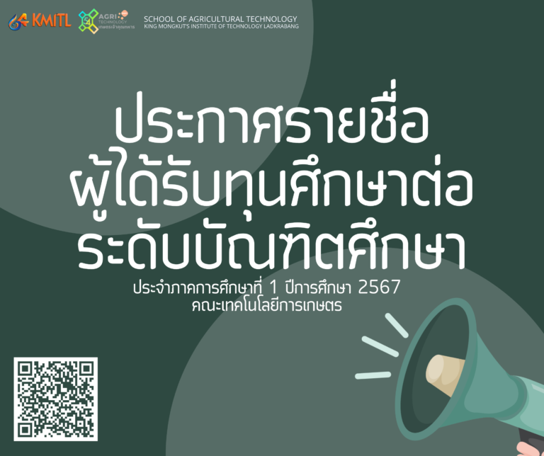 ประกาศรายชื่อผู้ได้รับทุนการศึกษาต่อระดับบัณฑิตศึกษา ประจำภาคเรียนที่ 1 ปีการศึกษา 2567 คณะเทคโนโลยีการเกษตรBy Thapana / 25/07/2024 ดูรายชื่อที่นี่ : https://bit.ly/4c0JUy9นักศึกษาที่ได้รับรับและเตรียมเอกสารตามที่ระบุไว้ท้ายประกาศ และส่งตามวัน เวลา ที่กำหนด ต่อไปสอบถามข้อมูลเพิ่มเติม 02-329-8000 ต่อ 7163 (งานบัณฑิต คณะเกษตรฯ สจล. ห้อง C113 อาคารเจ้าคุณทหาร)