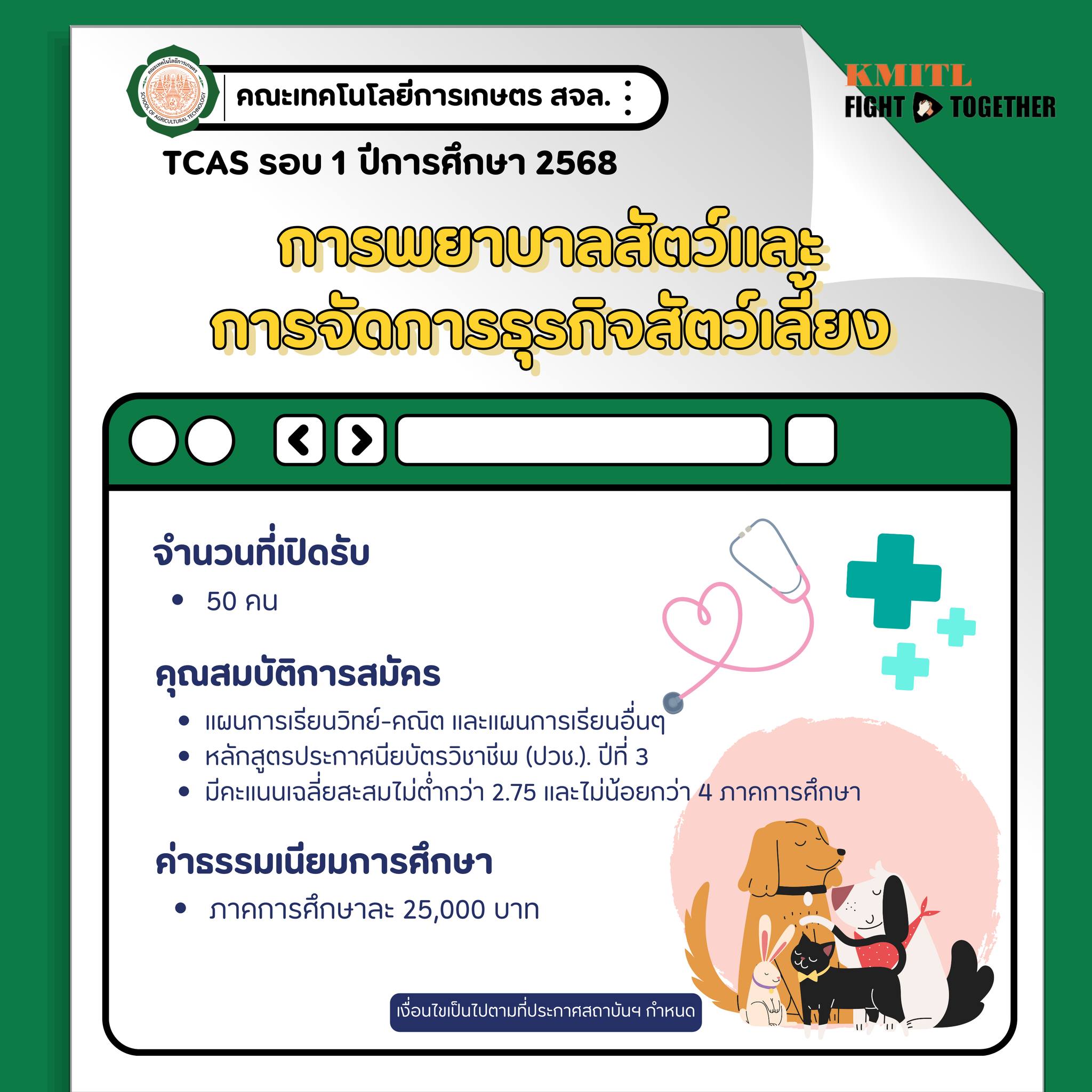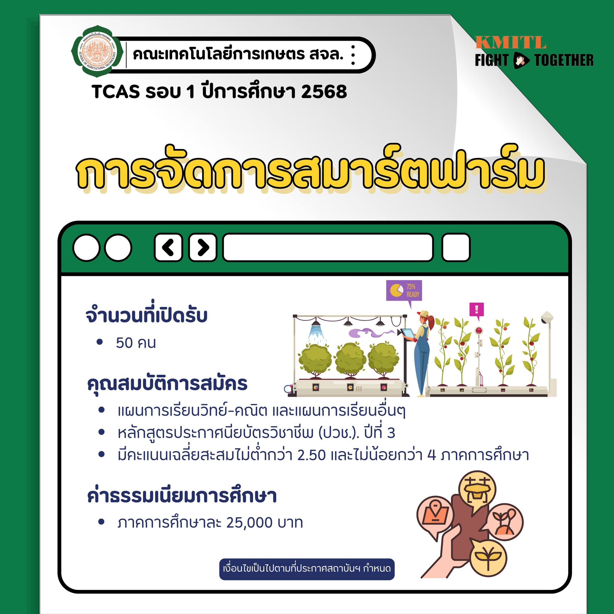 เปิดรับสมัครเข้าศึกษาต่อระดับปริญญาตรี คณะเทคโนโลยีการเกษตร TCAS รอบที่ 1 Portfolio (1-1 ถึง 1-4) ปีการศึกษา 2568By Thapana / 09/09/2024 รายละเอียดคุณสมบัติตามประกาศ :https://bit.ly/3XiYfAz สมัครสอบได้ที่ :https://new.reg.kmitl.ac.th/admission/#/ หากมีข้อสงสัยหรือต้องการข้อมูลเพิ่มเติม ติดต่อได้ที่Line: @agrikmitl (มี@)โทร. 02-329-8000 ต่อ 7138, 7149 (งานทะเบียน)