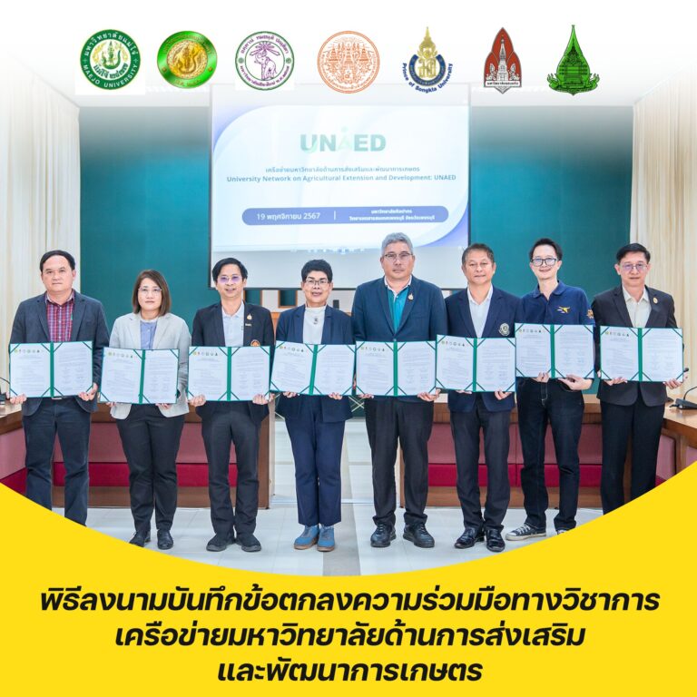 ผศ.ดร.กุลชัย กุลตวนิช อาจารย์ประจำภาควิชานวัตกรรมการสื่อสารและพัฒนาการเกษตร ลงนามในบันทึกความร่วมมือกับคณบดีผู้แทนจากมหาวิทยาลัยอีก 7 แห่ง ซึ่งจัดการเรียนการสอนระดับปริญญาตรีและบัณฑิตศึกษาด้านการส่งเสริมและพัฒนาการเกษตร คือ