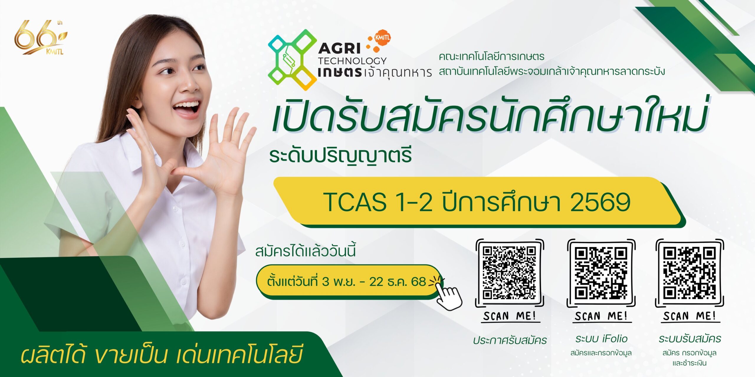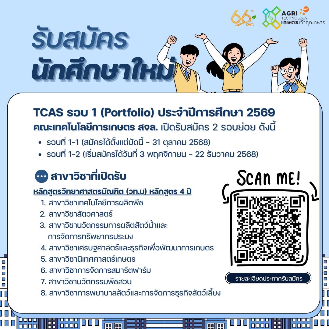 ข่าวและกิจกรรม ข่าวทั้งหมด รับสมัครนักศึกษา ทุนการศึกษา ข่าวคณะ รับสมัครงาน กิจกรรมในคณะ กิจกรรม RoadShow เปิดรับสมัคร TCAS รอบ 1-2 ประจำปีการศึกษา 2569 แล้ววันนี้ สมัครได้ตั้งแต่วันที่ 3 พ.ย. - 22 ธ.ค. 68 03/11/2025 นักวิทย์เกษตรคว้ารางวัล BestOralPresentation งานประชุมวิชาการ ICIST ครั้งที่ 13 03/11/2025 รวมคำถาม TCAS รอบ 1 ที่ถามกันบ่อยๆ มาตอบให้น้องๆแล้ว ใกล้จะปิดรับสมัครรอบ 1-1 แล้วน้าา รีบสมัครกันนะคะน้องๆ 28/10/2025 Line OpenChat เฉพาะการรับสมัคร TCAS รอบ 1 ปีการศึกษา 2569 คณะเทคโนโลยีการเกษตร สจล. เท่านั้น 28/10/2025 ประกวดออกแบบโลโก้ชิงเงินรางวัล ร่วมส่งผลงานเข้าประกวดออกแบบตราสัญลักษณ์ #มูลนิธิการกีฬามหาวิทยาลัยแห่งประเทศไทย 28/10/2025 ประกาศรายชื่อผู้ผ่านการสอบสัมภาษณ์และมีสิทธิ์เข้าศึกษาในระดับบัณฑิตศึกษา ประจำภาคการศึกษาที่ 2/2568 22/10/2025 คณะเทคโนโลยีการเกษตร ขอแสดงความยินดี กับ รศ.ดร.กนกรัตน์ ศรีกิจเกษมวัฒน์ สังกัด ภาควิชาเทคโนโลยีการผลิตสัตว์และประมง 20/10/2025 คณะเทคโนโลยีการเกษตร ขอแสดงความยินดี กับ รศ.ดร.ณัฐกร สงคราม และดร.ภัทราภรณ์ แต้มสุวรรณ สังกัด ภาควิชานวัตกรรมการสื่อสารและพัฒนาการเกษตร 20/10/2025 ประกาศรายชื่อผู้มีสิทธิ์สอบสัมภาษณ์เข้าศึกษาต่อระดับบัณฑิตศึกษา เทอม 2/68 17/10/2025 TCAS 1 รอบแฟ้มสะสมผลงาน ประจำปีการศึกษา 2569 เปิดรับสมัคร 2 รอบย่อย 17/10/2025 กลับมาอีกครั้งกับเทศกาล อิ่มอุ่น เติมพลังช่วงสอบ กับเมนูชูใจ ชูกำลัง 🥚Scrambled Eggs with Bacon Cheese Toast 15/10/2025 ขอเชิญนักวิจัย นักศึกษา และผู้สนใจทุกท่าน เข้าร่วมส่งผลงานในการประชุมวิชาการระดับชาติเกษตรพระจอมเกล้าเจ้าคุณทหารลาดกระบัง ครั้งที่ 9 15/10/2025 Ready to ride, ready to vibe! พบกับกิจกรรมดี ๆ “ANY-WHEEL Drive Safely” ชวนปั่น ชวนฝึก ชวนสนุกไปกับจักรยานสุดสมาร์ต 15/10/2025 คณะเทคโนโลยีการเกษตร ร่วมกับ Vet Products Group จัดกิจกรรม “Pork Master From Meat to Market” หลักสูตรแห่งชาติที่มุ่งยกระดับผู้ประกอบการและ SME ให้สามารถต่อยอดธุรกิจเนื้อสัตว์ได้อย่างครบวงจร 15/10/2025 นักศึกษาและบุคลากร รับสิทธิ์ Google AI Pro (Gemini) ฟรี 1 ปี 09/10/2025 รับสมัครงาน บริษัท น้ำมันอินฟินิตี้ จำกัด 09/10/2025 ธนาคารกรุงเทพ จำกัด (มหาชน) เชิญชวนนักศึกษา สจล. ที่มีอายุระหว่าง 15-24 ปี สมัครเข้าร่วมอบรมและประกวดคลิปวีดิโอสั้น Influencer Next Gen 09/10/2025 ทีมเกษตรแสดงความยินดีคณบดีวิทยาศาสตร์และคณบดีอุตสาหกรรมอาหาร 09/10/2025 คณะเทคโนโลยีการเกษตร สถาบันเทคโนโลยีพระจอมเกล้าเจ้าคุณทหารลาดกระบัง ขอแสดงความยินดีกับ ดร.สุมิตรา วัฒนา ศิษย์เก่าเกษตรเจ้าคุณทหาร รุ่น 19 สาขาวิชาปฐพีวิทยา 07/10/2025 กองทุนวิจัย สจล. เปิดรับสมัคร ทุนสนับสนุนการวิจัยสำหรับอาจารย์ที่ปรึกษา เพื่อสนับสนุน “ผู้ช่วยวิจัยระดับบัณฑิตศึกษา” ทุนปริญญาโท ปีการศึ